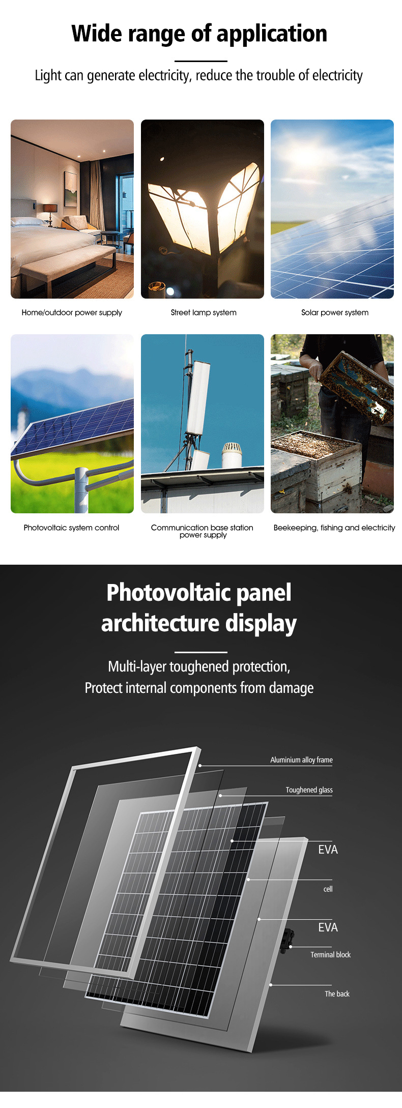Product description: Product size :1130*670*30 Component efficiency :19.81% Cell type: single crystal silicon Output power :150W Output current :7.8A Operating voltage :19.0V Open circuit voltage :22.4V